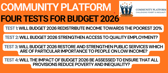 posted by Paul Ginnell : September 22, 2025 3:50 pmIn advance of Budget 2026, the Community Platform published its annual Four Tests for Budget 2026. The Platform calls on the Government to leave a positive legacy on addressing poverty, social exclusion and inequality, and to deliver sustainable changes to build a stronger, fairer, and more resilient society, in which everyone can live with dignity. … Continue reading Four Tests for Budget 2026